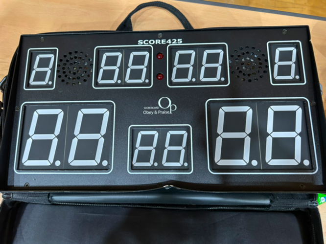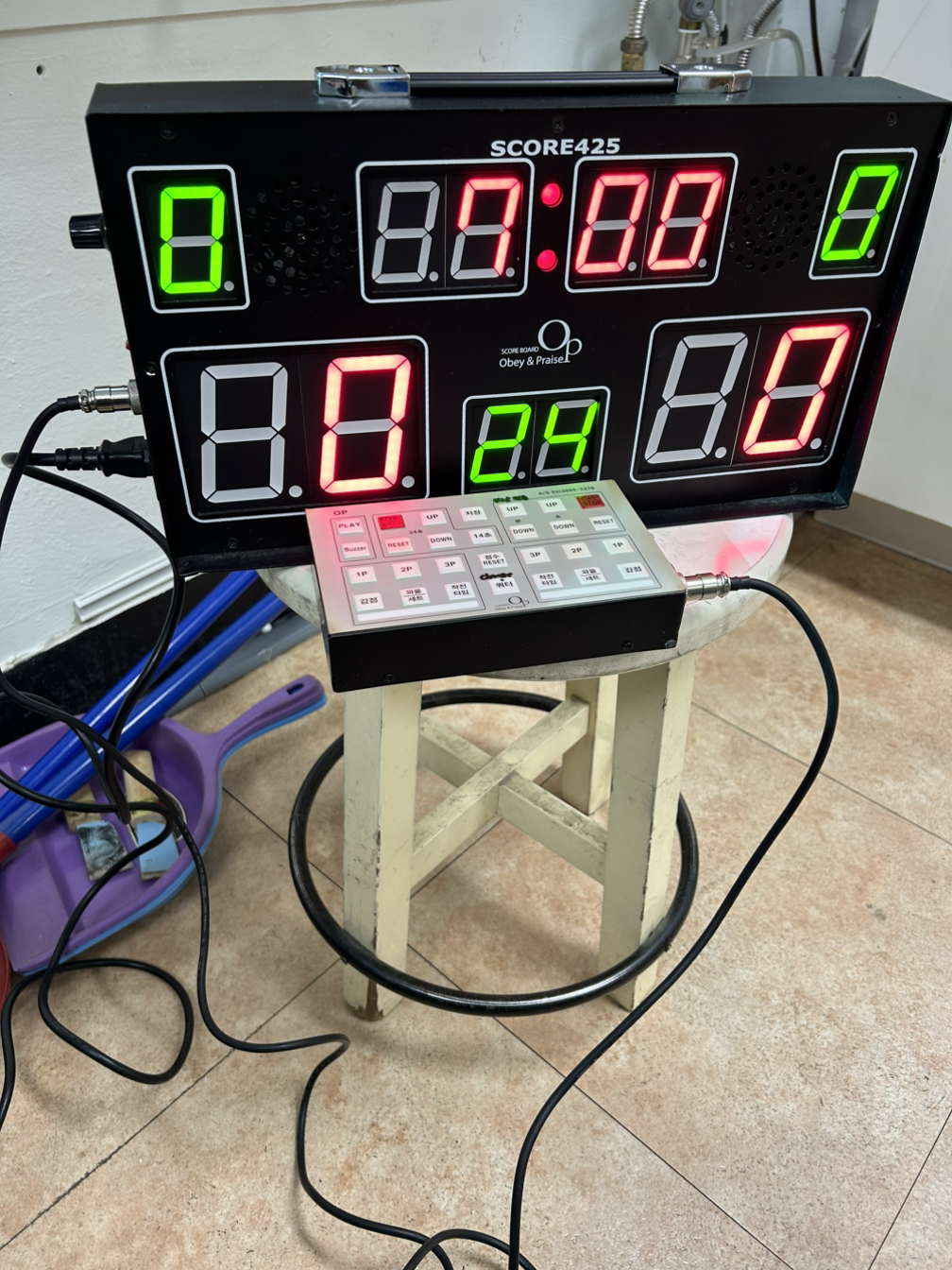 구기대회를 앞두고 농구반 여자 아이들이 전자 점수판을 만지작거리고 있었다.