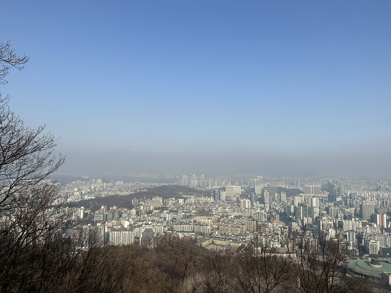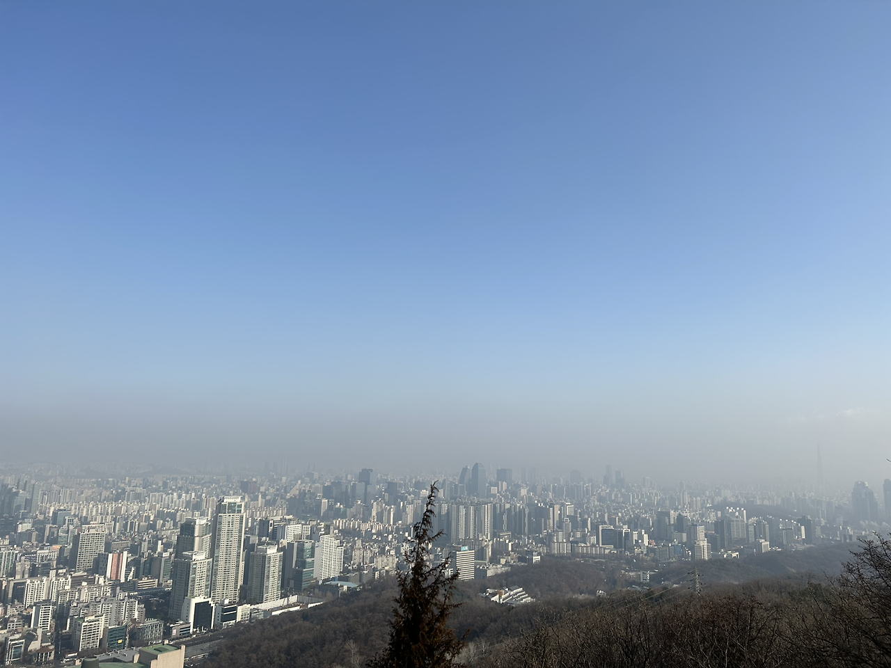 우여곡절 끝에 소망탑이 있는 봉우리에 도착했다. 아내의 입에서 나오는 감탄. 그녀는 '우와 우와'를 연발했고 핸드폰을 꺼내 사진을 찍기 시작했다. 낮은 산이었지만 나름 서울 시내가 한눈에 보였다. 미세먼지가 살짝 낀 것 같아 아쉬웠다.