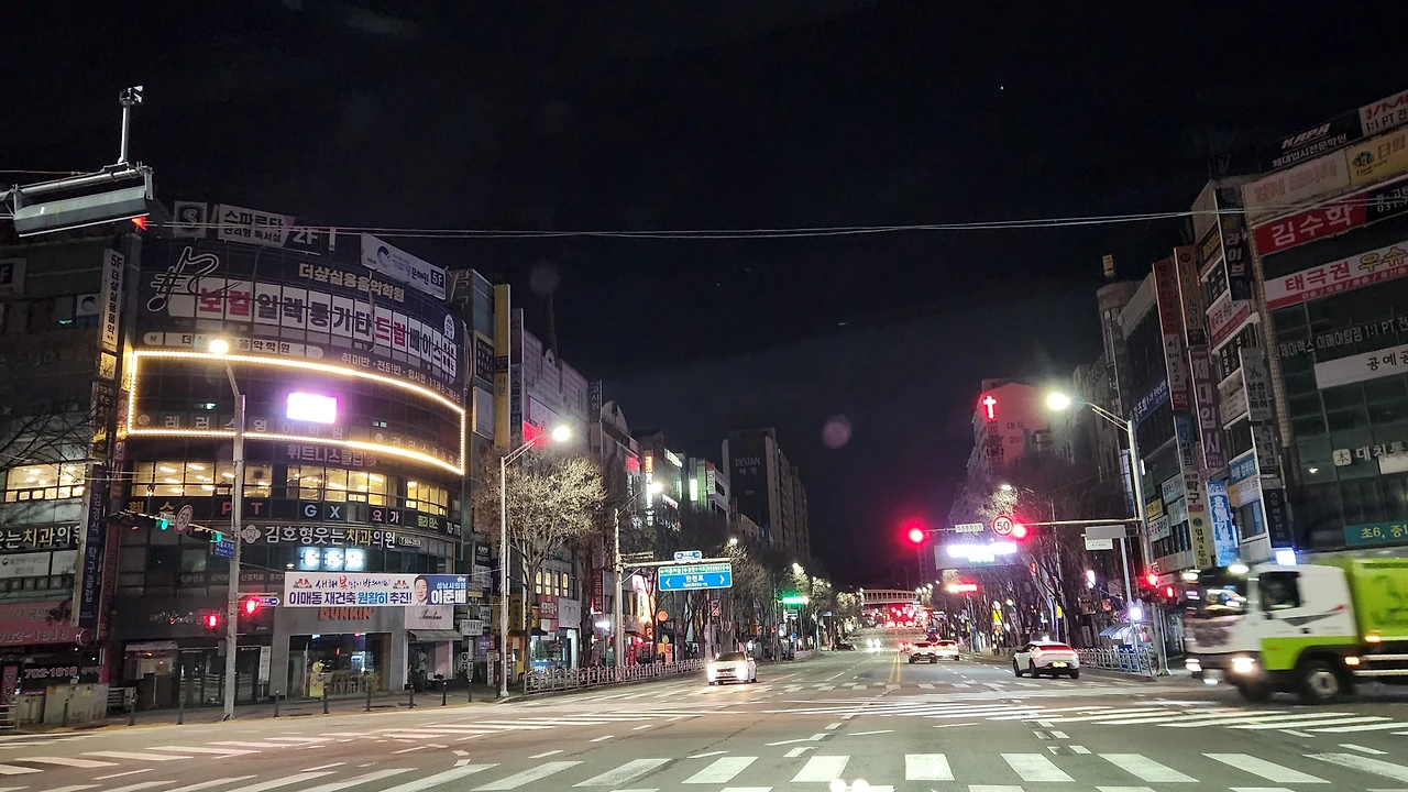 멀리 빨간 신호등이 보인다.