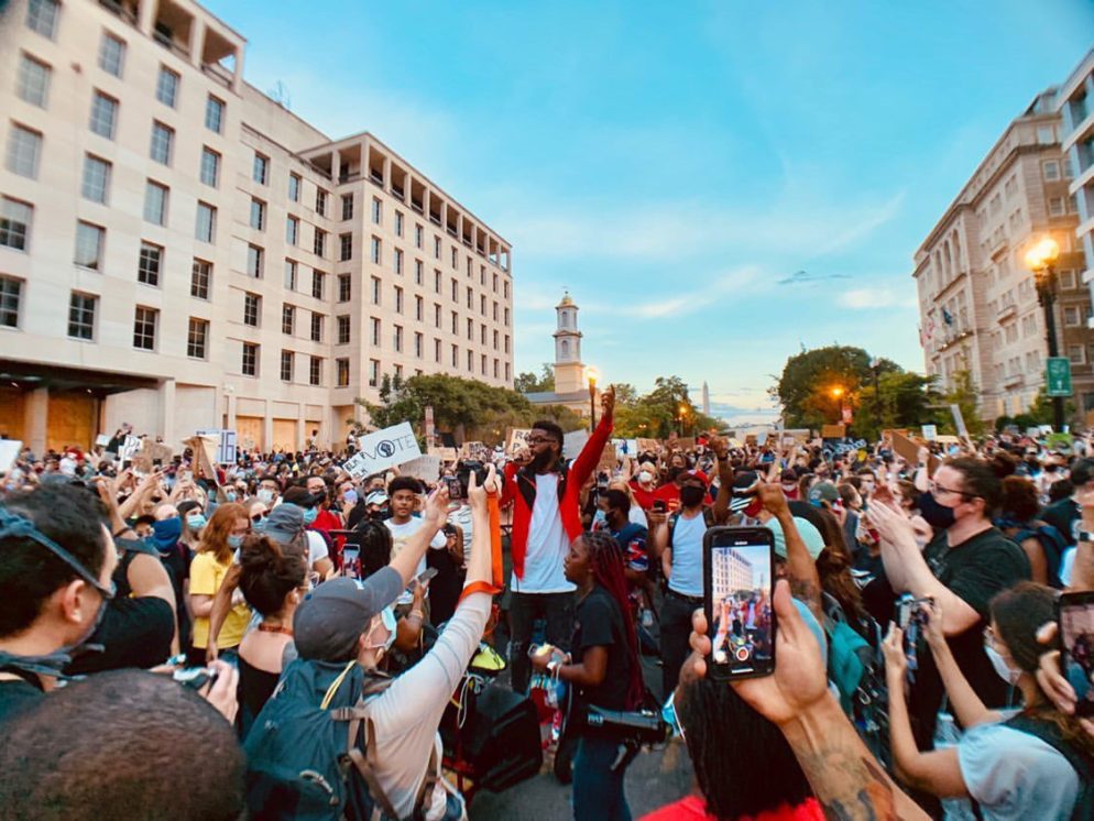 방에서 벗어나 이어폰을 빼고 광장에서 듣는 노래의 힘은 어떨까? 인종 차별 항의 집회에서 대중들이 ‘Lean on me’를 따라 부르고 있다. washingtonian.com에서 인용.