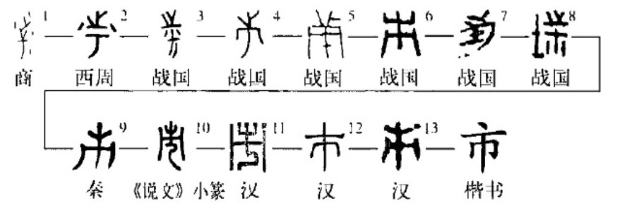 市(저자 시)는 갑골문을 보면 발이 닿는 곳이다. 저자거리에는 사람들 발길(止)이 모이고 섞이니 시끄럽고 혼잡하다. 아랫부분은 兮(어조사 혜)인데 그렇게 소리가 번잡하게 퍼져 나가는 것을 나타낸다. 얼마나 시끄러웠으면 兮로는 모자라, 윗부분에 발 주변으로 점까지 두세 개씩을 찍어 놓았다.([표2] 1~3) '야료(惹鬧) 부린다'는 말이 있다. 까닭 없이 트집을 잡고 함부로 떠들어 대는 것을 가리키는 말인데, 뒷글자 鬧(시끄러울 료/뇨))는 鬥(싸울 투)와 市(저자 시)의 합자다. 온갖 사람들이 흥정과 모략, 비방과 분쟁으로 요란법석을 떠는 곳이 시장이라는 것이다. 주 1)