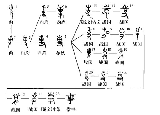 옛날에 지배자나 제사장들은 정치적 또는 종교적으로 권위와 위엄을 드러내기 위해서 특별한 도구 하나씩을 손에 지니고 다녔다. 그 장면이 갑골문 事다. 무당이 굿을 하거나 점을 칠 때 신령과 교통 하기 위한 매개물로 무당 방울(무령(巫鈴))을 치켜 흔드는 것은 여전히 남아 있는 事의 흔적이다. (【표】 1~6) 주)