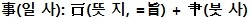 事(일 사)는 뜻(旨)과 붓(肀)을 합한 자다. 旨(뜻 지)는 원래 빈 숟가락을 핥을 정도로 '음식이 맛있다(味道甘美)'는 의미로 만들어졌다가 그 모양이 변한 것인데 뒤에 그 의미도 '뜻'으로 가차 되어 변한다. 교지(教旨), 성지(聖旨), 취지(趣旨), 유지(遺旨) 등으로 격식을 차린 표현에 많이 쓰인다. 肀(붓 사)는 손에 붓을 들고 글을 쓰는 장면을 그린 모양자다.
