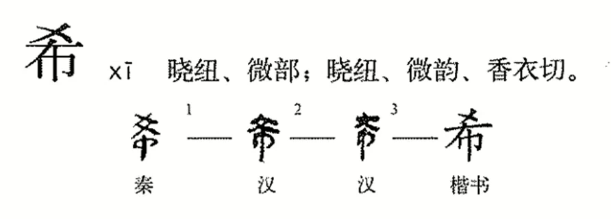 주) 巾은 갑골문, 布는 금문 그리고 希는 전문에서 처음 발견된다. 따라서 그 순서대로 글자들이 만들어졌다고 봐야 한다. 전문 希는 그 하단이 앞 시대 두 글자 중에 굳이 巾을 선택한 것이 분명하다. 예서(隸書)까지고 그 모양이 유지되다가 마지막 해서(楷書)에서 멋을 부려 쓸데없는 혼란을 불러왔다.