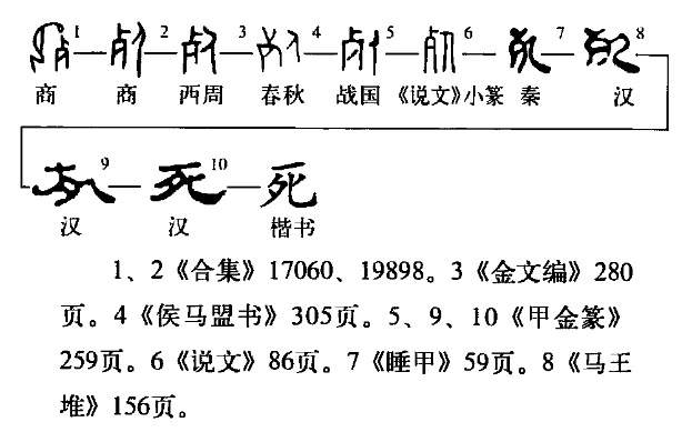 갑골문 死(죽을 사)는 살이 썩거나 발라져 뼈만 남은 시신(歹) 옆에서 무릎을 꿇고 고개를 숙여 명복을 빌고 있는 사람(匕)의 모습니다. 그 사람을 갑골문 이후 내도록 人으로 쓰다가 해서에 이르러서는 匕로 바뀐다. 이 匕를 대체로 人의 변형이라 보기는 하는데, 化(될 화)를 생략해서 붙인 것이라는 해석도 있다.( 【 표 】 1 )