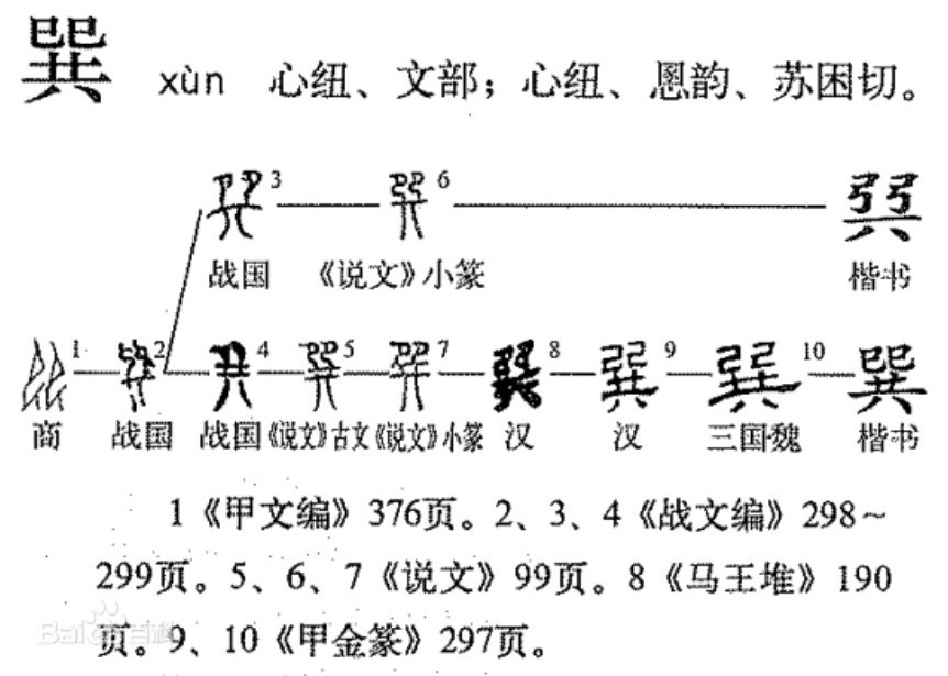 주) 1. 갑골문 이후 巽은 복잡한 자형변천을 거친다. 하지만, 단순한 모양의 변형일 뿐이다. '한쪽으로 무릎 꿇은 두 사람'이라는 최초의 모티브는 일관된다. 변천은 글을 적는 재료와 서풍(書风)의 변화가 반영된 영향일 뿐이다.