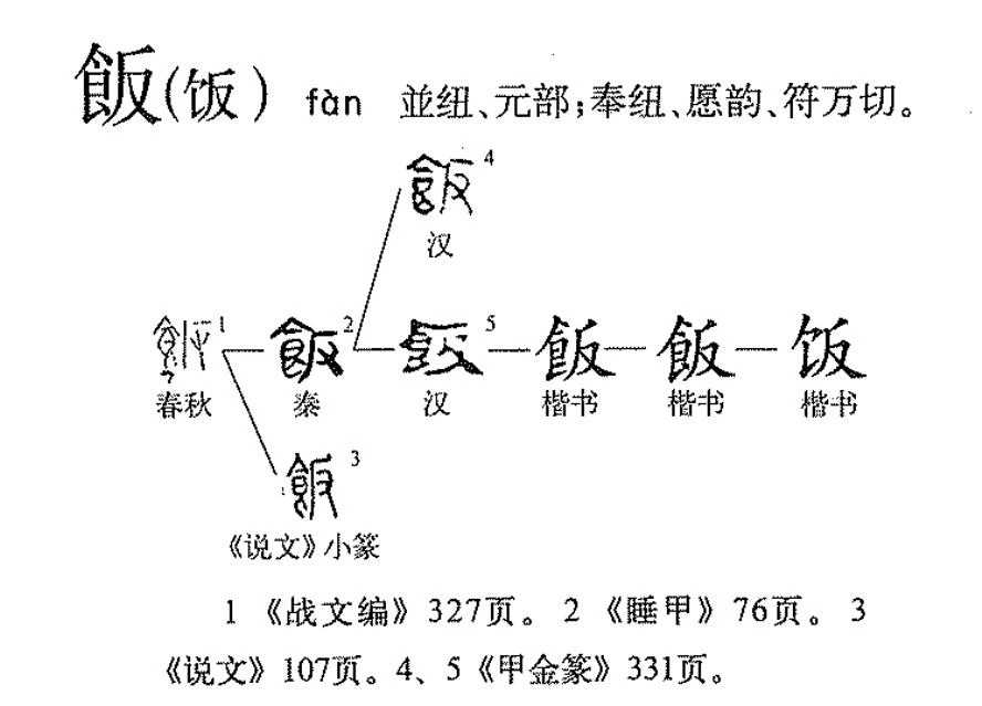 飯은 춘추시대(BC 770~403) 금문으로 처음 발견된다. 갑골문 食의 상대(商代)(BC 1600~1046)와 비교하면, 그 격차는 대략 수백, 아니 어쩌면 일천 년도 훌쩍 넘는다. 척박한 상고시대에는 '밥'과 '밥 아닌 먹거리'에 구분이 필요치 않았을 것이다. 그러니, 그저 食 하나로도 충분했고, 그 세월은 그렇게 장구했다. 飯은 그렇게 대륙이 춘추시대를 맞아 철기와 우경(牛耕)에 익숙해 지기를 기다려야 했다. 飯의 조자(造字)와 농업생산성의 증대가 춘추시대에서 겹치는 것은 우연일 리가 없다.