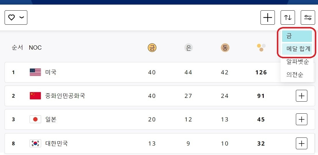 사족, 올림픽 국가별 순위는 메달 획득이 기준이다. 그 방식에는 '금메달순'과 '합계순', 두 가지가 있다. 우리나라는 '금메달순'으로 공표해 왔던 것 같은데, 이번 파리 올림픽에 대해서는 '합계순'을 병행해서 보여 주었다.