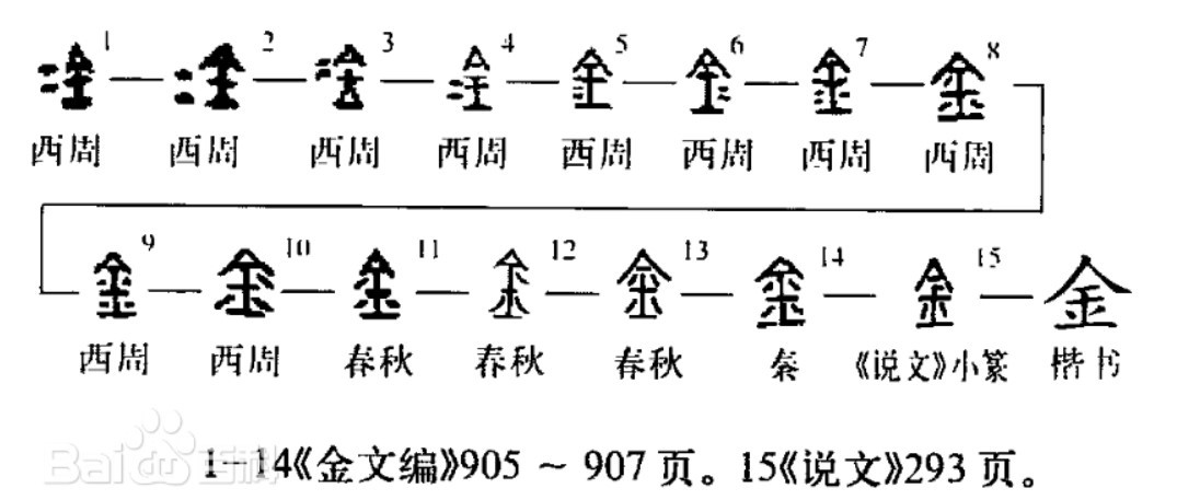 서주(西周)는 청동기 시대였다. 따라서, 서주금문 金은 청동기를 만드는 과정이고, 그것을 통해 《說文》에서 언급된 적금(赤金), 즉 '구리(铜)'를 가리킨 것이다. 그러니까, 아주 원래는 金이 구리였다. 그러다 차차 야금술이 발달하게 되자, 구리보다 훨씬 단단하고 채굴이나 제련이 어려웠던 금속들을 쉽게 가공할 수 있게 된다. 그러나, 한동안은 그 모든 것들을 그냥 金이라 불렀다. 그것은 《說文》이 밝힌 바와 온전히 일치한다. 주 4)