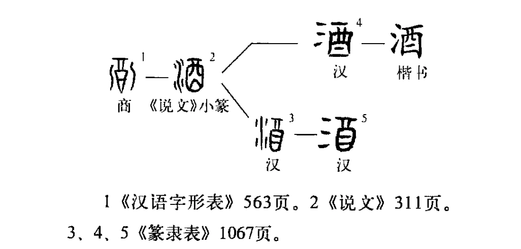 왠지는 모르겠으나 후에 십이지에 열 번째 글자로 酉가 쓰이면서 그 상징인 닭이라는 뜻까지 추가되자, 부득이 술을 구별해 가리키리고 水(氵)를 붙이니, 그것이 지금의 酒(술 주)가 되었다.(2, 3, 4, 5)