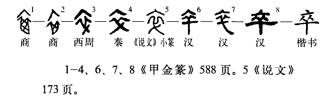 卒(마칠/죽을 졸)은 옛날 사병, 특히 보병들이 입던 군복이다. 갑골자를 보면 꺽쇠처럼 생긴 투구와 X자로 얼키설키 엮인 전투복이 허술하기가 짝이 없다.(1, 2, 3) 그 모양이니, 전쟁터에 끌려 나간 병사들이 여간해서 살아 돌아오기가 어렵지 않았겠나! 그 새김말에 ‘마치다’, ‘죽는다’가 더해진 연고가 그러하다.