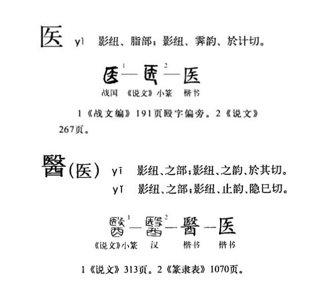 그런 치료 행위 또는 그것을 하는 사람을 医(의사 의)라고 부르게 된다. 지금으로 치면 군의관인데, 그것이 일반화되면서 병을 고치는 사람들을 医(의사 의)라 가리키게 된다. 알 수 없는 만 가지 이유로 아픈 병(病), 제 멋대로인 마음을 다스리지 못해 아픈 환(患), 살이 갈라지고 뼈가 부러져 아픈 상(傷)을 치료하는 전문가를 칭하는 말이 된 것이다.(표 상단 1)