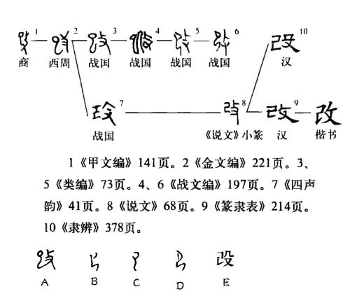 주) 1. 改의 갑골자는 기(己, 사람) 자 자리를 이(已, 이미/벌써) 자가 대신한다.(1, 2, 3) 已(이미 이)는 아직 태중에 있지만 다 자라서 출산에 임박한 태아를 가리키는데, 그래서 '이미', '벌써'라는 의미를 갖는다. 그래도, 사람을 가리키는 것은 다르지 않다.