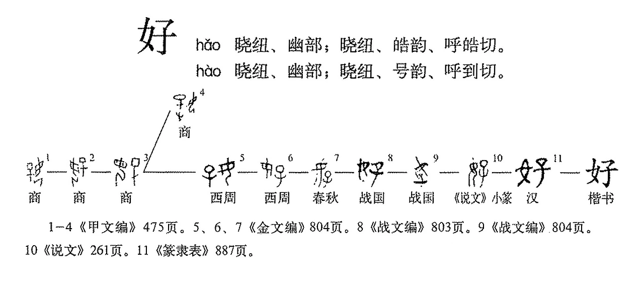 好(좋을 호)는 여자(女)와 아들(子)을 함께 그린 글자다. 好의 자형 변천 내도록 두 글자의 이 결합 구조에는 아무런 변함이 없다. 글자 간에 순서가 바뀐 적이 몇 번 있는데 특별한 의미가 없어 보인다.(1, 4, 5)