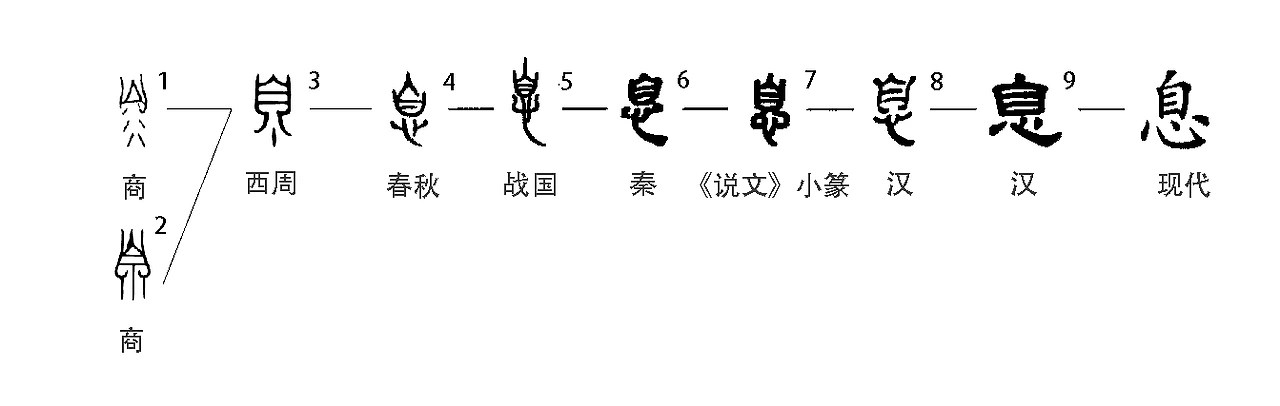 息(쉴 식)은 갑골문이나 금문을 보면 코가 숨을 쉬고 있는 모습이다. 콧구멍으로 숨이 점이나 선으로 뿜어 나오는 모양이 생생하다.(1, 2, 3) 춘추전국을 지나면서 아래 부분 ‘숨’은 心이 되고, 윗부분에 코는 직선으로 차츰 간화가 되었고 예서(隸書)에 이르러 지금의 自 모양이 된다.(5~9)