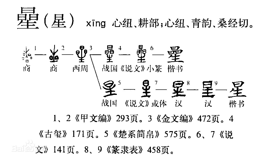 갑골문에서 나무 둘레와 가지 사이에 있던 별들이 금문과 소전에서 가지 끝에 달린다. 별의 운동을 보다 정교하게 체계적으로 살피기 시작했음을 나타낸다. 별과 태양이 같은 종이라는 지식이 굳어지자 굳이 귀찮게 여러 개를 그리지도 않게 된다. 曐이 星으로 변한 것은 단순히 간화(簡化) 때문만이 아니다. 역법과 천문학이 발전한 결과일지도 모른다. (표2)