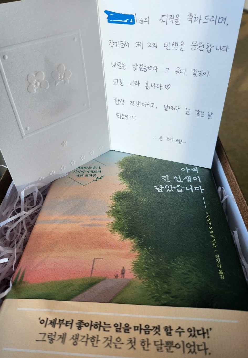 감동이다. 어린애 인 줄만 알았던 조카가 이모 퇴직을 축하한다며 제2 인생을 살아라며 책 두 권을 들고 왔다. 난 부끄러워 노안이 와서 활자 보기가 힘들다고 쫑알대며 받았다. 마치 정년을 앞둔 나 같아 어둠을 향해 가는 해를 그윽한 눈으로 바라보는 나에게 조카가 부탁말을 한다.