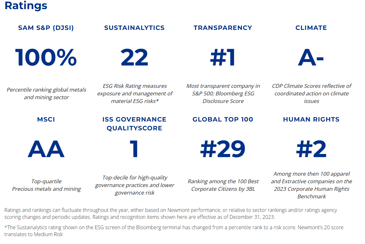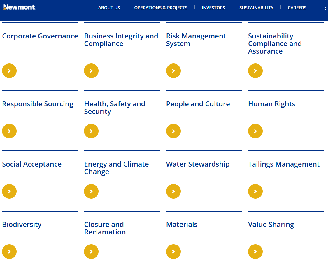 세계 최대의 금 생산 기업인 Newmont라는 미국 콜로라도 덴버에 본사가 위치한 회사다. 광산 채굴이라는 환경오염을 시킬 수밖에 없는 비즈니스이다. 이 기업이 본인들의 지속가능성에 대하여 어떻게 보여주고, 표현하는지를 본다면 한국의 기업들과 달리 현재 미국 기업들이 지속가능성을 대하는 자세를 알 수 있다. 더 자세한 내용은 홈페이지에서 확인 가능하다.