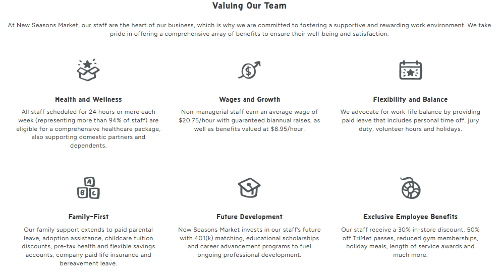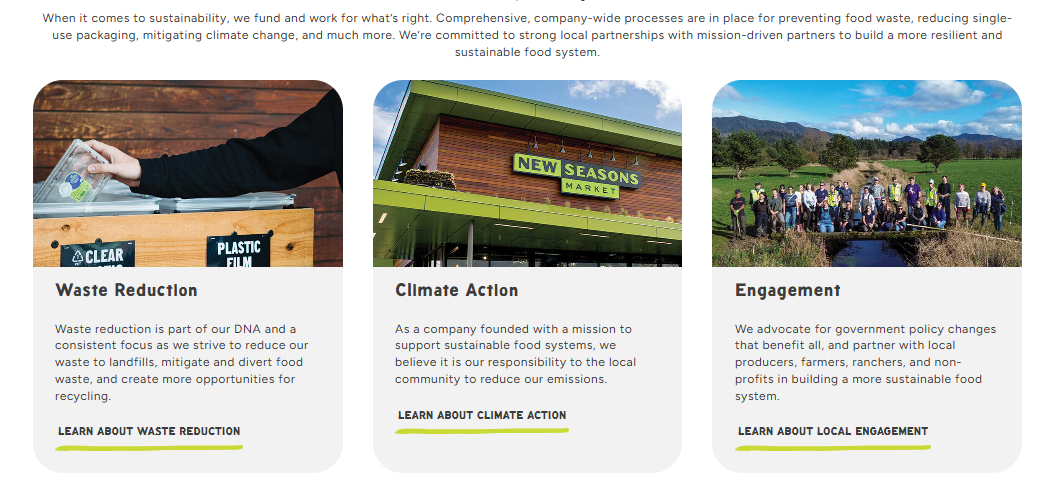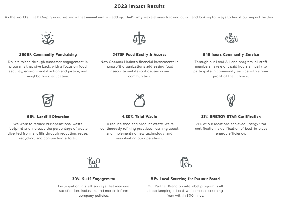 한국에서는 S(사회)와 관련하여 기업의 보여주기식 지역봉사, 기부 등을 주로 얘기하지만 미국의 지역기업들조차도 Social impact 측면에서 기업의 임직원의 발전이 기업의 발전과 함께함을 가정하며 가장 먼저 제시하는 것은 시간당 임금, 임금의 발전가능성, 휴가 관련 제도, 육아 관련 제도 등을 명확하게 제시한다. 거버넌스 측면에서도 다양한 강점을 제시하며 배당금의 분배, 의사결정의 투명성, 세금을 투명하게 잘 낸다는 것도 주요 강조 포인트 중 하나이다. 환경 측면에서 업사이클링, 용수관리, 재생에너지 활용 비율 등도 기본적으로 제시하고 있다. 이때 중요한 점은 대부분의 활동들은 '구체적인 숫자'로 제시된다는 것이다. 아래는 본인이 거주하고 있는 오레건주 포틀랜드시에서 시작한 로컬의 식품, 제품을 주로 다루고 있는 New Seasons Market이라는 지역 슈퍼마켓 체인의 내외부 Impact와 내부 직원에 대한 노력에 관한 공개 자료이다. 이 밖에 지역 기업이면서 글로벌 기업인 Columbia, Nike, Intel과 같은 대기업들은 더욱, 매우 자세하게 제시하고 있다.