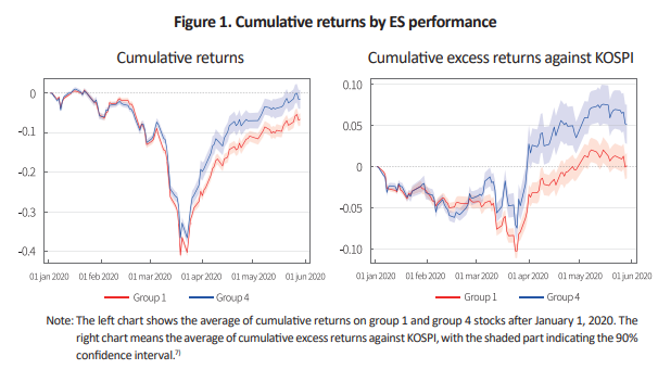 한국에서도 자본시장연구원에 의하여 이와 관련한 연구가 데이터를 기반으로 진행되었고, 이를 뒷받침하는 결과가 아래와 같이 도출된 바가 있다.(출처 : Source : Park, Hyejin. 2021. “ESG Stock Performance amid Covid 19”. Capital Market Focus. KCMI( 자본시장연구원))