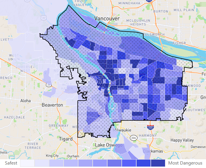 애틀랜타의 범죄율은 전국 평균보다 높습니다. 이웃스카우트의 데이터에 따르면 애틀랜타의 폭력 범죄 발생률은 주민 1,000명당 7.18건으로 전국 평균이 1,000명당 4건인 것에 비해 높은 편입니다. 재산 범죄의 경우 애틀랜타의 비율은 주민 1,000명당 40.42건이며, 전국 평균은 주민 1,000명당 19건입니다(https://www.neighborhoodscout.com/or/portland/crime). 통상적으로 Downtown으로 갈수록 범죄율이 높아진다는 것을 감안한다면 이 수치는 더욱 문제가 됩니다. 아래 그림의 좌측은 애틀랜타, 우측은 제가 살고 있는 포틀랜드의 폭력 범죄 발생률 자료이며, 진한 파란색일수록 'Most Dangerous'를 의미합니다. 바로 보일 만큼 애틀랜타의 범죄율이 높다는 것을 확인할 수 있습니다. 이러한 지역 문제는 Flock Safety에게는 좋은 기회였으며, 자신들의 서비스를 시험할 수 있는 좋은 테스트베드의 역할을 하였습니다.