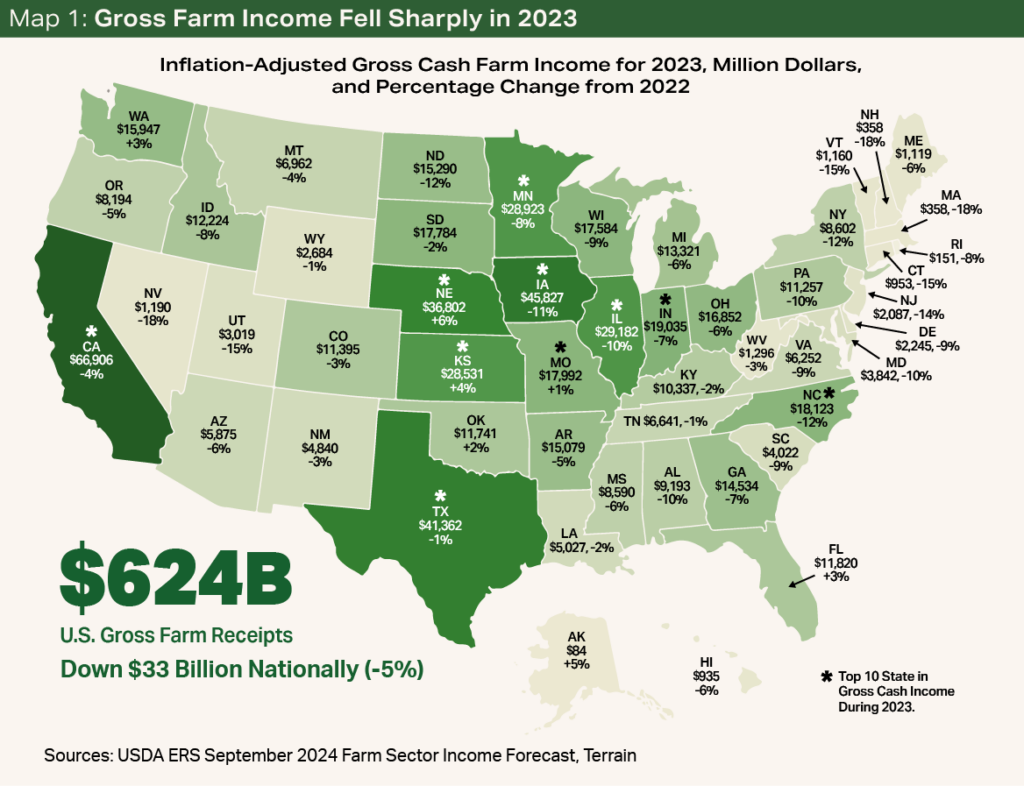 먼저 캘리포니아주가 미국의 농업에서 차지하는 비중을 알아야 한다. 아래 그림은 2023년 기준 미국의 총 농업 소득이 6,240억 달러이며, 이 중 캘리포니아주가 670억 달러로 미국 내 1위를 차지(약 11%)하고 있다. 흔히 우리가 상상하는 옥수수, 밀이 많은 미국의 중부가 아닌 캘리포니아의 농업 소득이 1위인 것이다. (출처 : https://www.terrainag.com/insights/first-look-2023-farm-profitability-by-state/)