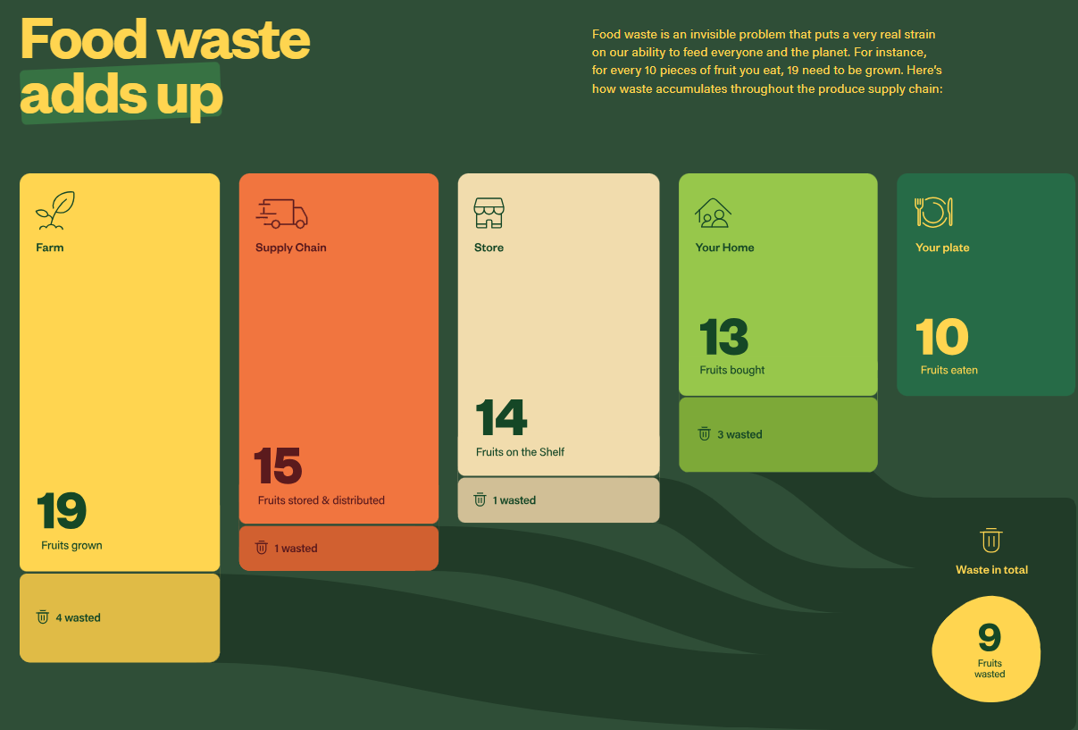 문제의식: 매년 약 2.6조 달러의 식량이 낭비되고, 이는 주로 과일과 채소 같은 신선식품이 유통 중 상하거나 소비되지 못해서 발생한다.