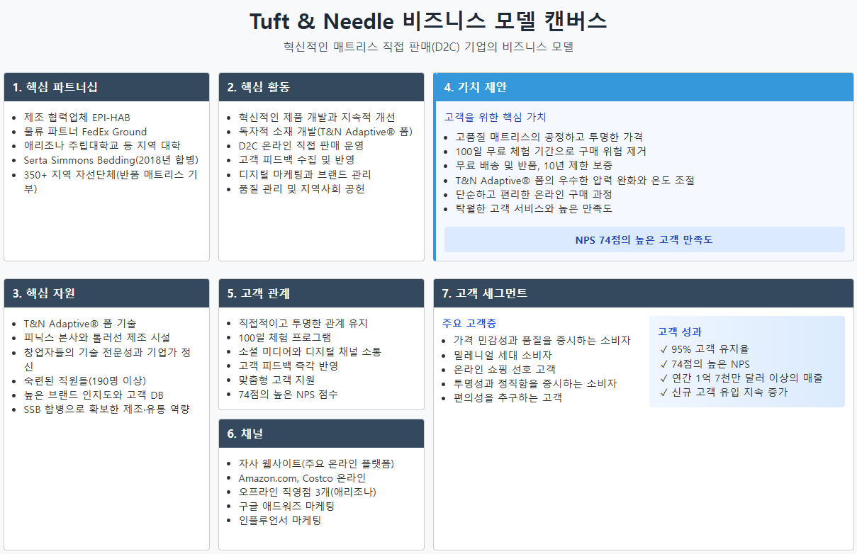 시장은 Serta, Sealy와 같은 기존 거대 기업들이 장악하고 있었고, 동시에 Casper, Leesa 등 새로운 D2C 경쟁자들이 빠르게 등장하며 '침대 배송' 시장의 경쟁은 날로 치열해졌다. 이러한 환경 속에서 터프트앤니들은 "하나의 완벽한 매트리스"라는 명확한 메시지, 정직한 가격 정책, 그리고 고객 피드백을 통한 끊임없는 제품 개선으로 차별화를 꾀했다.