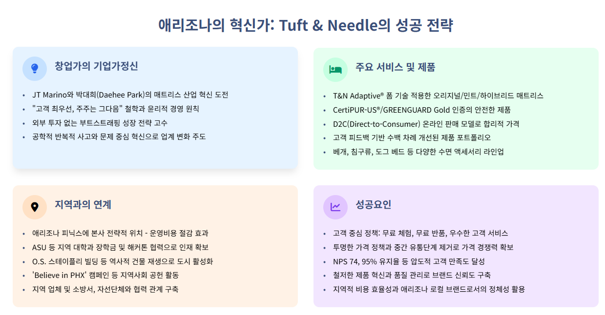 터프트앤니들의 사례는 명확한 문제 정의, 고객에 대한 집착, 그리고 영리한 비즈니스 모델이 결합될 때 전통 산업이 얼마나 효과적으로 파괴되고 재창조될 수 있는지를 보여준다. 특히 재정적 제약 속에서도 놀라운 매출 성장을 일궈낸 그들의 부트스트래핑 성공 신화는 많은 스타트업에게 영감을 준다. 더 나아가, 그들이 실리콘밸리가 아닌 지역 도시에서 성장하며 지역사회와 긍정적인 관계를 구축한 방식은 오늘날 많은 스타트업과 지역 경제 주체들에게 중요한 시사점을 제공한다. 그들의 다음 행보가 매트리스 산업, 그리고 D2C 시장 전체에 어떤 변화를 가져올지 주목할 필요가 있다.
