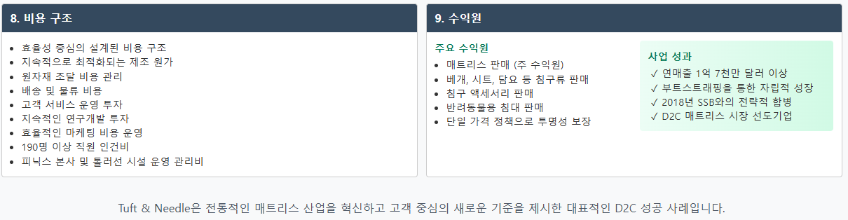 터프트앤니들의 서사는 단순히 '침대 배송(bed-in-a-box)' 트렌드의 일부로 치부될 수 없다. 그 성공은 명확한 문제 인식, 창업가들의 독특한 철학, 그리고 영리한 전략적 선택들이 복합적으로 작용한 결과물이다.