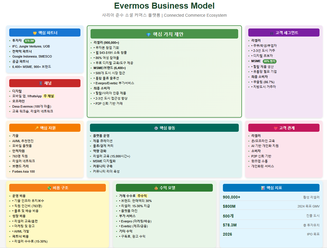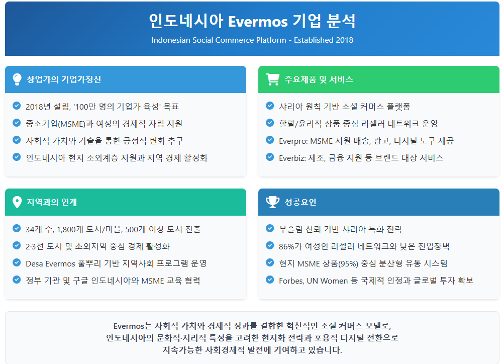 Evermos는 단순한 전자상거래 기업을 넘어, 인도네시아의 독특한 문화적, 경제적 맥락 속에서 사회적 문제 해결과 상업적 성공을 결합시킨 강력한 모델을 구축했습니다. 샤리아 준수라는 문화적 코드를 비즈니스 핵심에 통합하고, 리셀러 네트워크를 통해 물류와 신뢰의 장벽을 넘었으며, MSME 지원 생태계를 구축하여 지속 가능한 성장의 기반을 마련했습니다.