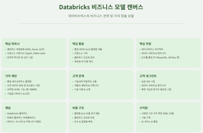 창업팀의 DNA와 오픈소스 리더십: Spark에서 이어진 깊은 기술적 이해와 오픈소스 생태계(Spark, Delta Lake, MLflow, DBRX)에 대한 영향력은 개발자 커뮤니티를 확보하고 기술 표준을 주도하는 데 기여한다.