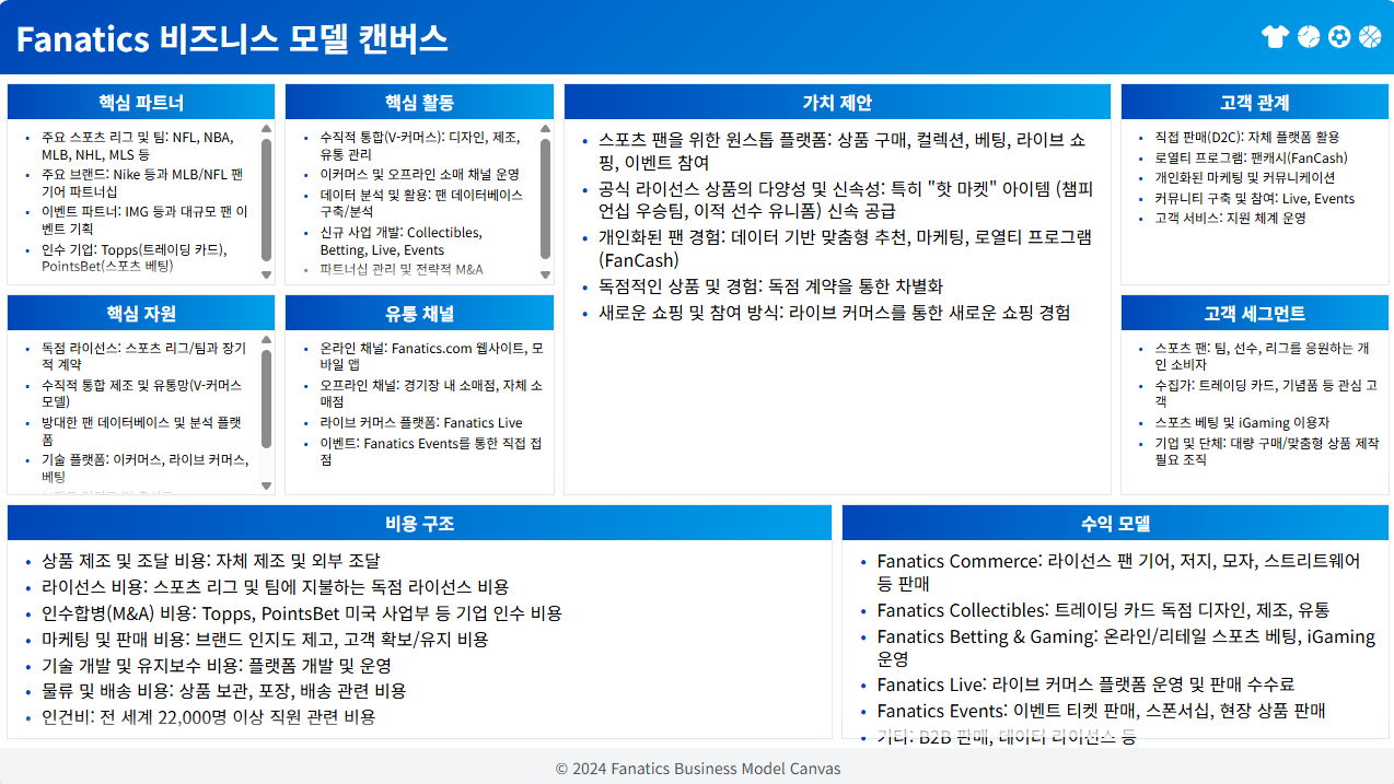 파나틱스는 상품 판매(Commerce)를 시발점으로, 수집품(Collectibles), 베팅 및 게이밍(Betting & Gaming), 라이브 커머스(Live), 이벤트(Events)로 사업 영역을 다각화하며 '글로벌 디지털 스포츠 플랫폼'으로의 변모를 꾀하고 있다. 이는 개별 사업의 단순한 집합을 넘어, 각 사업 부문이 상호작용하며 시너지를 창출하는 '플라이휠 효과(flywheel effect)'를 의도한 것이다.