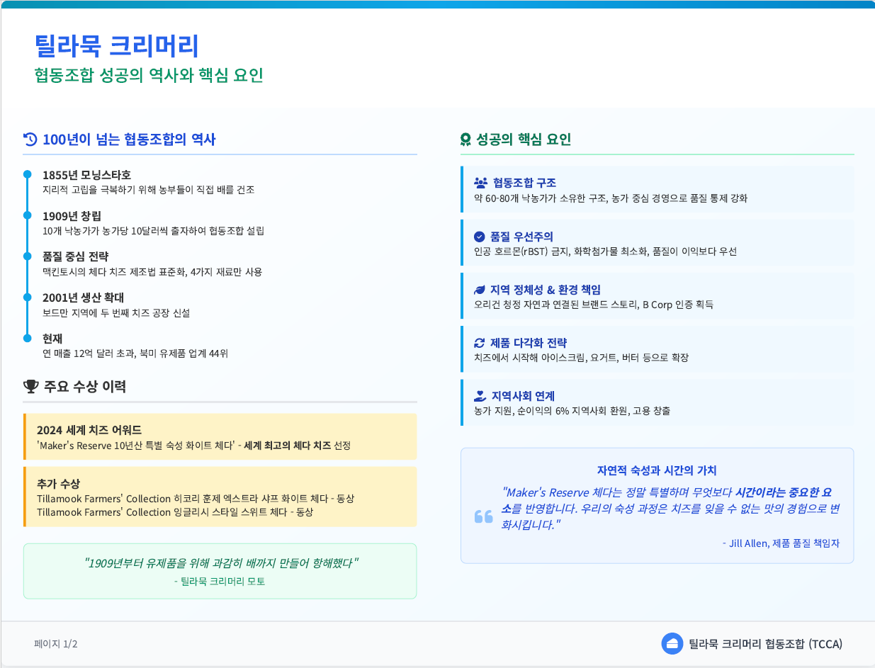 오늘날의 비즈니스 환경은 종종 파괴적인 기술과 빛처럼 빠른 성장 스토리에 초점을 맞추지만, 전통적인 산업에서 지속적인 가치와 깊은 경쟁 우위를 구축하는 기업으로부터 배울 점이 많습니다. 오리건에 본사를 둔 틸라묵 카운티 크리머리 협동조합(Tillamook County Creamery Association, TCCA)이 바로 그러한 주목할 만한 사례입니다. 100년이 넘는 기간 동안 소규모 지역 협동조합에서 연 매출 12억 달러를 넘어서는 전국적인 유제품 브랜드로 성장한 틸라묵의 여정은 단순한 유제품 생산 그 이상을 보여줍니다. 이는 독특한 소유 구조, 확고한 품질에 대한 약속, 그리고 지역사회와의 깊은 유대감을 바탕으로 어떻게 강력한 브랜드를 구축하고 유지할 수 있는지에 대한 매력적인 사례 연구입니다.