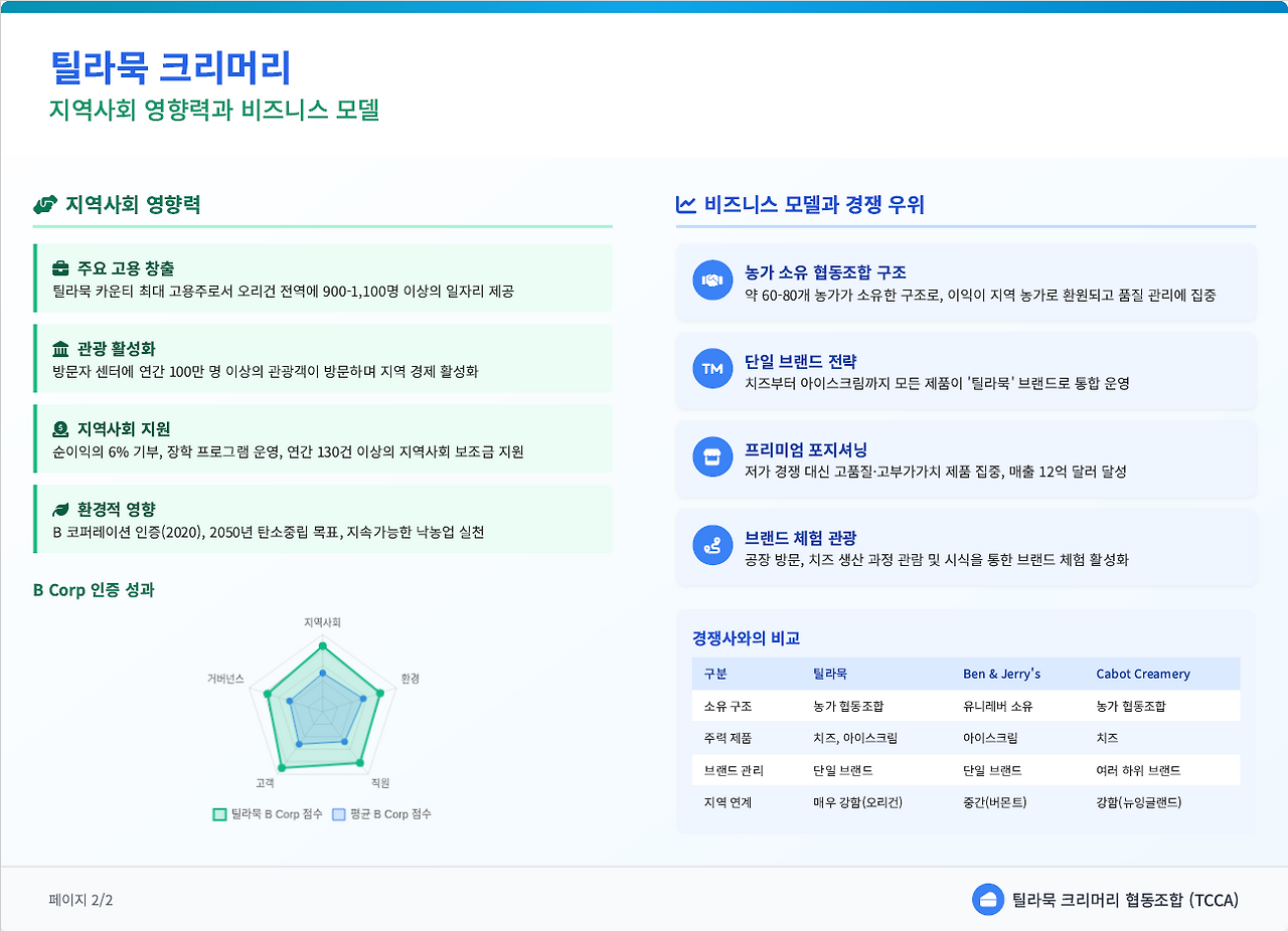 틸라묵은 본질적으로 농가 소유의 농업 협동조합입니다. 이는 기업의 이익이 외부 주주가 아닌 약 60여 농가 조합원에게 돌아가 그들의 경제적 지속 가능성을 보장하고 삶의 방식을 보존하는 구조입니다. 1909년에 설립된 이 협동조합은 현재 치즈, 아이스크림, 버터, 요거트, 사워크림 등 다양한 유제품을 생산하며, 미국 전역의 가정에서 사랑받는 브랜드로 자리 잡았습니다. 특히 2020년 B 코퍼레이션(B Corporation) 인증을 획득하며 사회적 및 환경적 성과, 투명성, 책임성에 대한 높은 기준을 공식적으로 인정받았습니다.