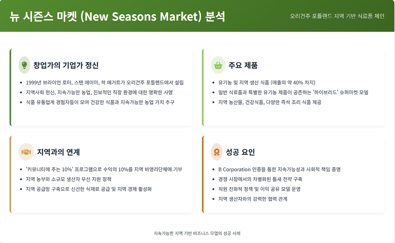 오늘 우리가 살펴볼 기업, 뉴 시즌스 마켓(New Seasons Market, 이하 NSM)은 단순한 지역 식료품 체인을 넘어섭니다. 오리건주 포틀랜드에 깊이 뿌리내린 이 기업은 '커뮤니티', '지속가능성', '진보적 가치'라는 독특한 조합을 전면에 내세우며 성장해 왔습니다. 하지만 성장의 이면에는 외부 자본 편입, 노동 문제, 그리고 창업 초기 가치 유지라는 쉽지 않은 과제들이 자리 잡고 있습니다. 본 분석은 NSM이 어떻게 '로컬'과 '가치'를 집적하여 독특한 고객 경험을 제공하려 했는지, 그리고 스케일 확장과 외부 환경 변화 속에서 그 본질을 지켜나가는 것이 얼마나 어려운 도전인지를 심층적으로 살펴보고자 합니다.