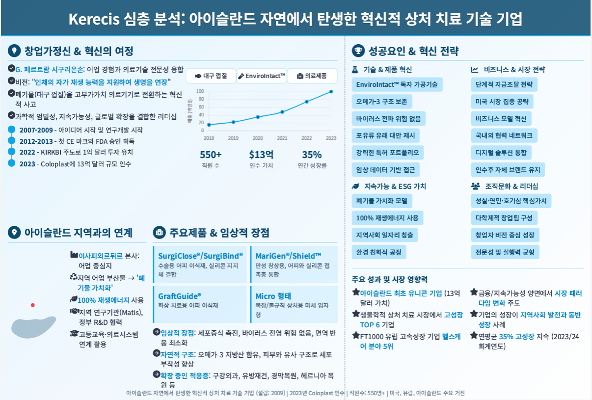 아이슬란드 정부 및 연구기관의 초기 지원 활용: 창업 초기, 아이슬란드 국립 식품 및 생명공학 연구소인 마티스(Matis)와의 협력을 통해 첫 시제품을 개발했고, 아이슬란드 기술 개발 기금 및 정부 소유 벤처 펀드로부터 초기 자금을 지원받는 등, 아이슬란드의 지역 혁신 시스템 내 지원을 효과적으로 활용했습니다. 이는 아이슬란드의 연구개발 장려 정책과 스타트업 지원 환경이 케레시스와 같은 기업의 성장에 중요한 토양을 제공했음을 보여줍니다.