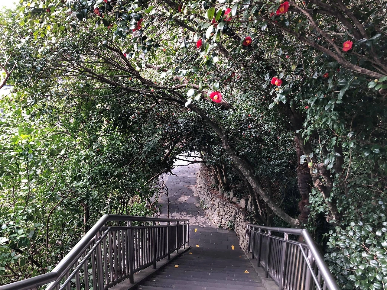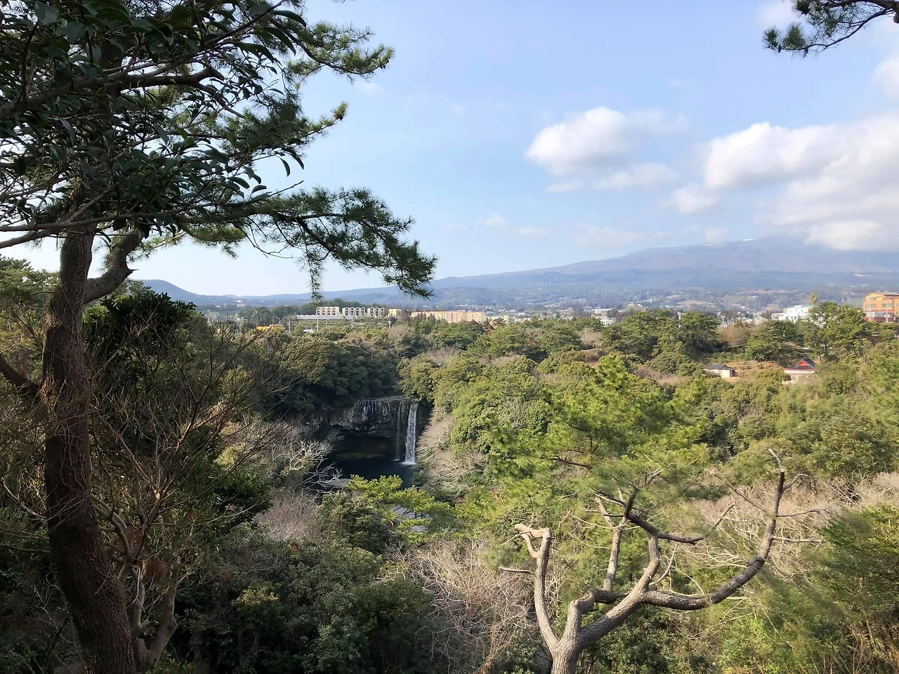 일반인들이 많이 찾지 않는 곳이다. 공원 안쪽으로 들어가면 산책길이 아담하고 예쁘다. 오늘 그곳에서 만개한 매화를 만났다. 봄이 왔다는 것을 실감했다. 매화나무 사이로 한라산이 보였다. 그런데 이곳은 비밀이 하나 있다. 공원 전망대에 이르면... 천지연 폭포를 만날 수 있다.