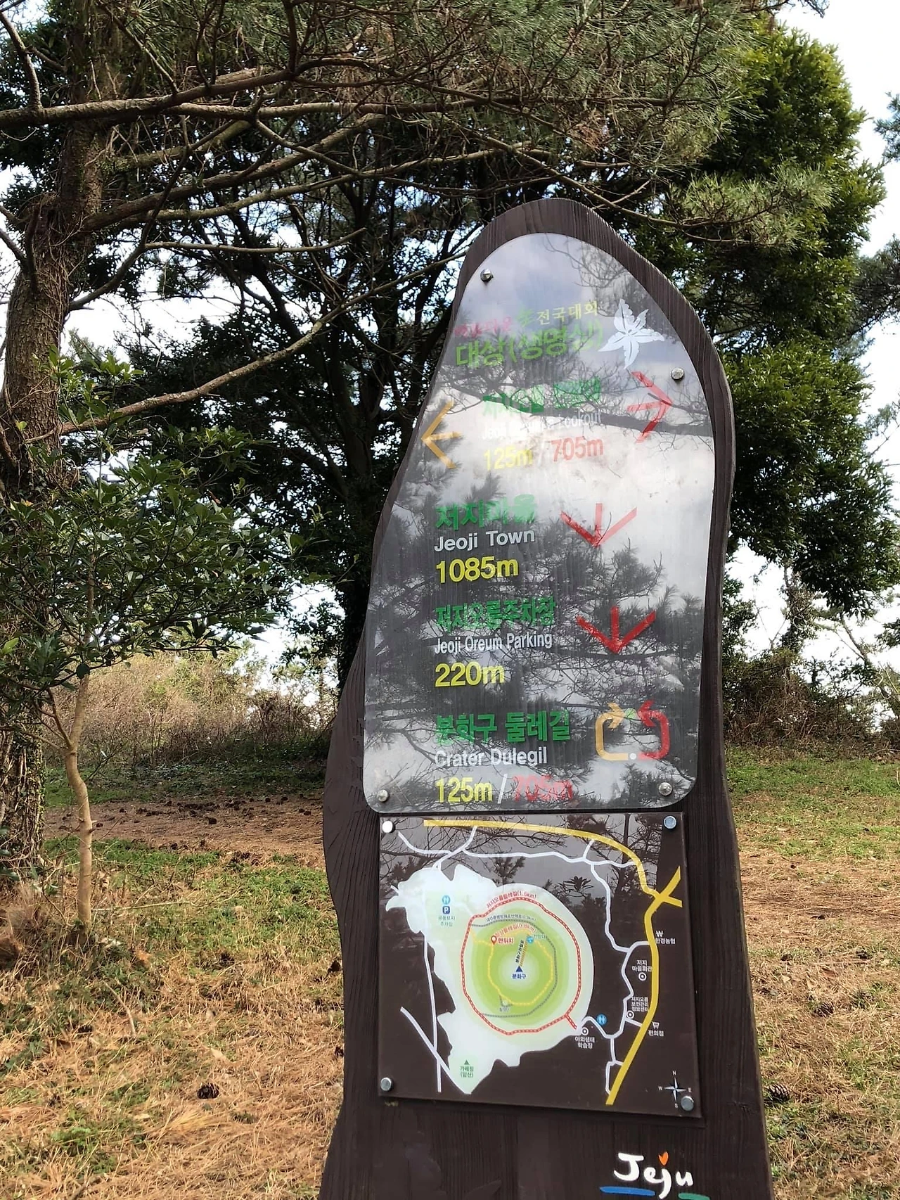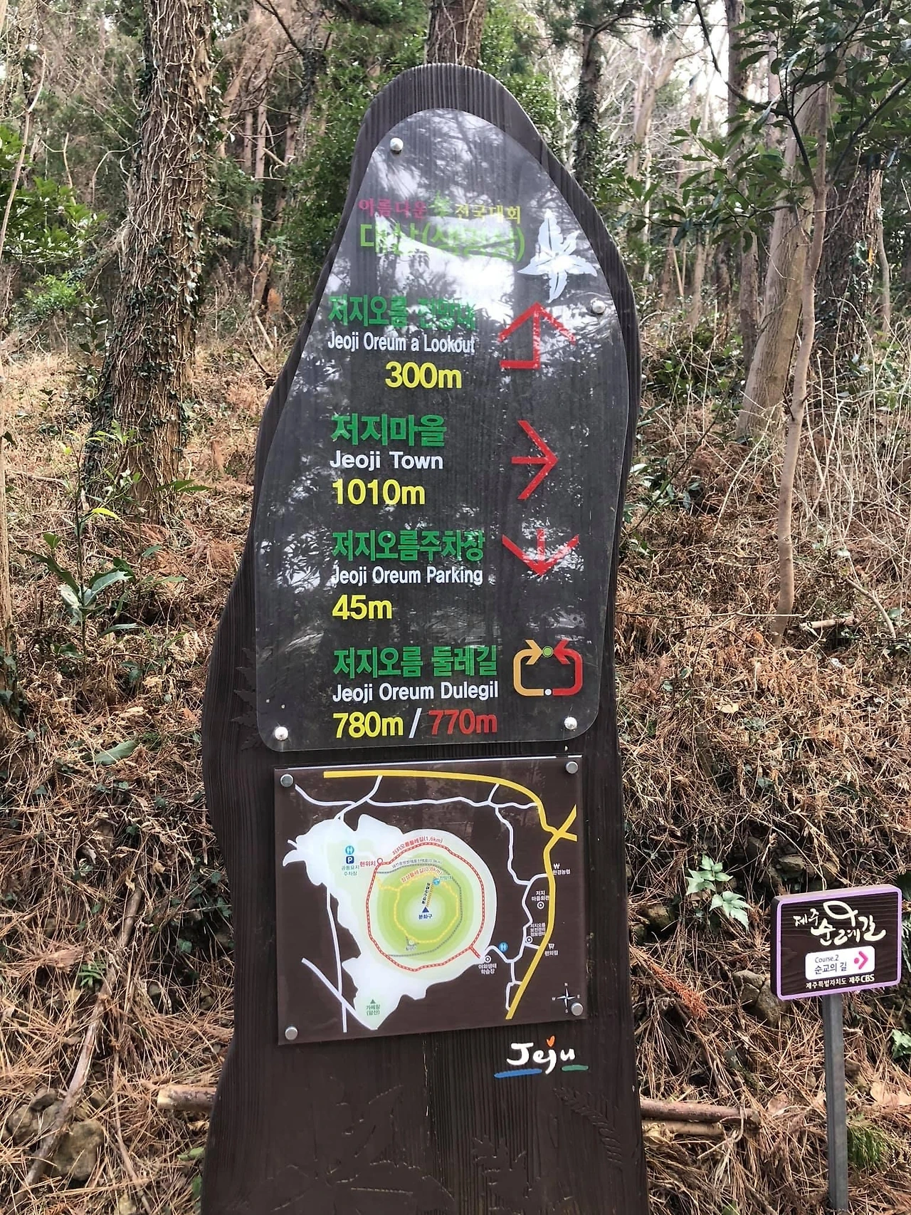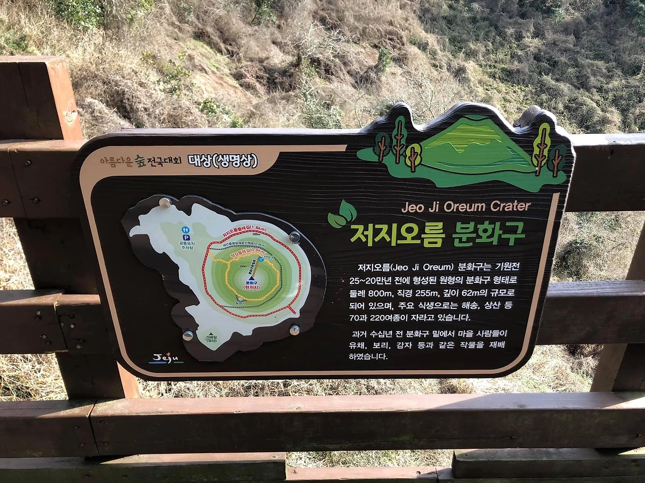 제주 서쪽 한경면 저지리에 있는 오름이다. 금오름과 달리 저지오름은 분화구가 자연그대로 보존되어 있었다. 분화구까지 내려가는 길엔 나무데크로 만든 계단이 안전하게 만들어져 있었는데 매우 가파르다. 분화구 안에 울창한 숲을 이루고 있어서 분화구가 뾰족한 깔대기형 이라고 할까? 경사가 심해서 그렇게 보였다. 저지오름은 정상둘레를 360도 걸을 수 있는 둘레길이 있다.
