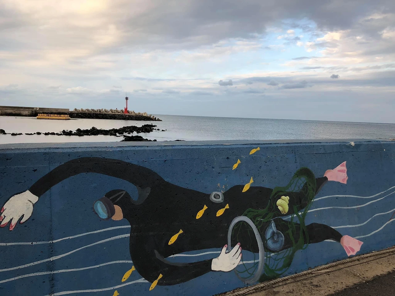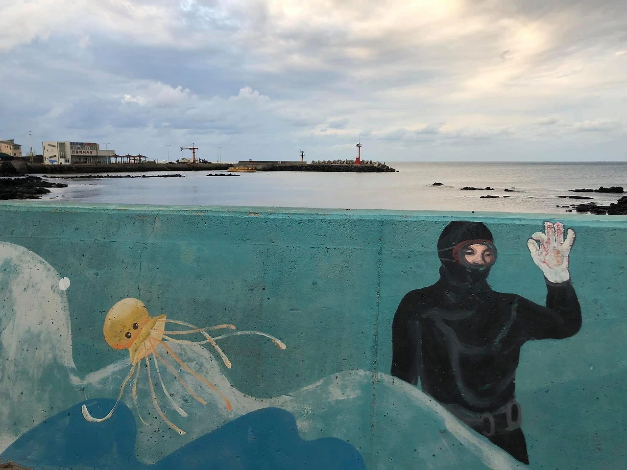 등잔 밑이 어둡다^^ 머물고 있는 제주의 보금자리 우리집 주변을 천천히 산책했다. 조금 걸어 나가면 바다가 있고, 콜라비 밭들이 펼쳐진다. 마을의 아기자기한 집들도 마치 영화 속에 등장하는 세트장처럼 이쁘다. 돌담길이 어찌나 이쁜지.... 제주에 와서 느낀건 사람들이 돌담으로 영역표시?를 한다고 해야 하나? ^^ 밭도, 들도, 집들도 ‘여기까지 내땅’이라고 약속이나 한 듯 돌담으로 쌓아올려 영역을 표시하고 있는 풍경들이 재밌다. 집에서 보이는 빨간 등대까지 걸어가 보기로 하고 올레길 도로를 따라 걷는데 바다 특유의 비릿한 바다냄새가 났다. 제주의 바람은 많이 불어도 차갑게 느껴지지 않았다. 등대 근처에 도착했을 때 그곳엔 <제주 한수풀 해녀학교>가 보였다.
