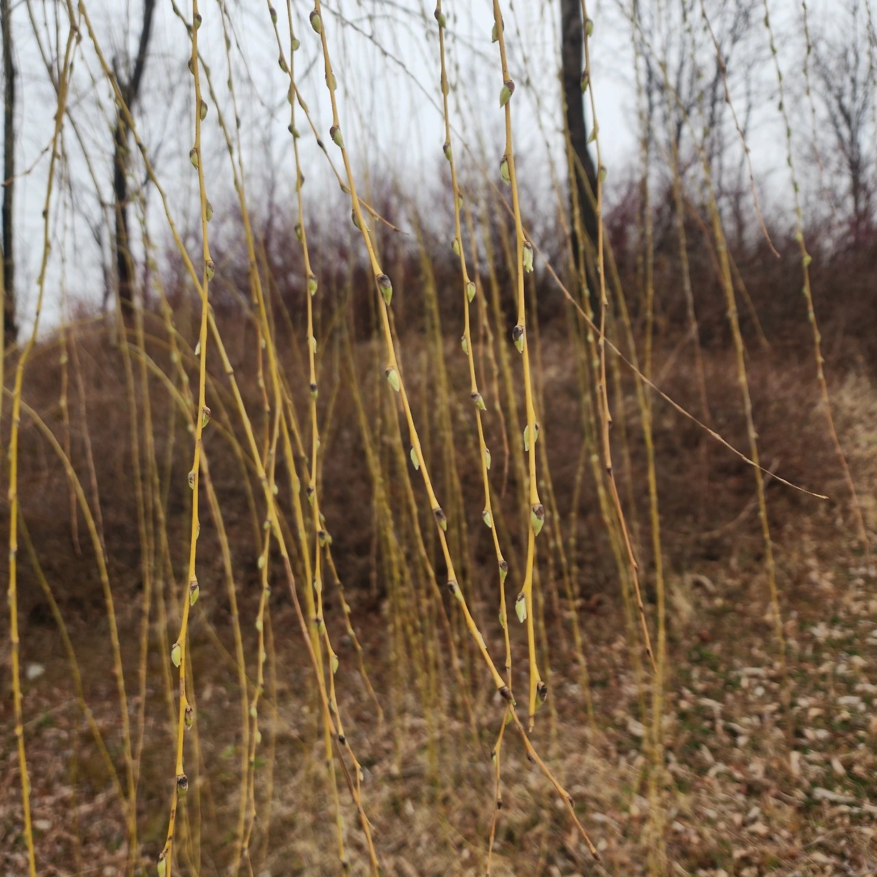 노랗게 빛나는 버드나무 가지가 바람에 흔들리고
