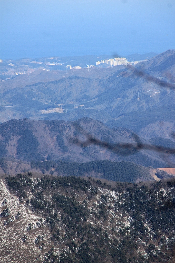 해발 1071m의 산에 변변한 정상석도 없이 정상임을 표시한 철제 팻말만이 눈밭에 나지막하게 세워져 있다. 문패나 간판의 화려함? 그게 무슨 대수겠는가. 산정에서 바다를 함께 본다는 게 얼마나 큰 호사스러움인가. 하늘과 해안선의 경계마저 얼었는지 그 선이 뚜렷하지 않은 겨울 바다의 낭만을 한껏 즐기는 중이다.