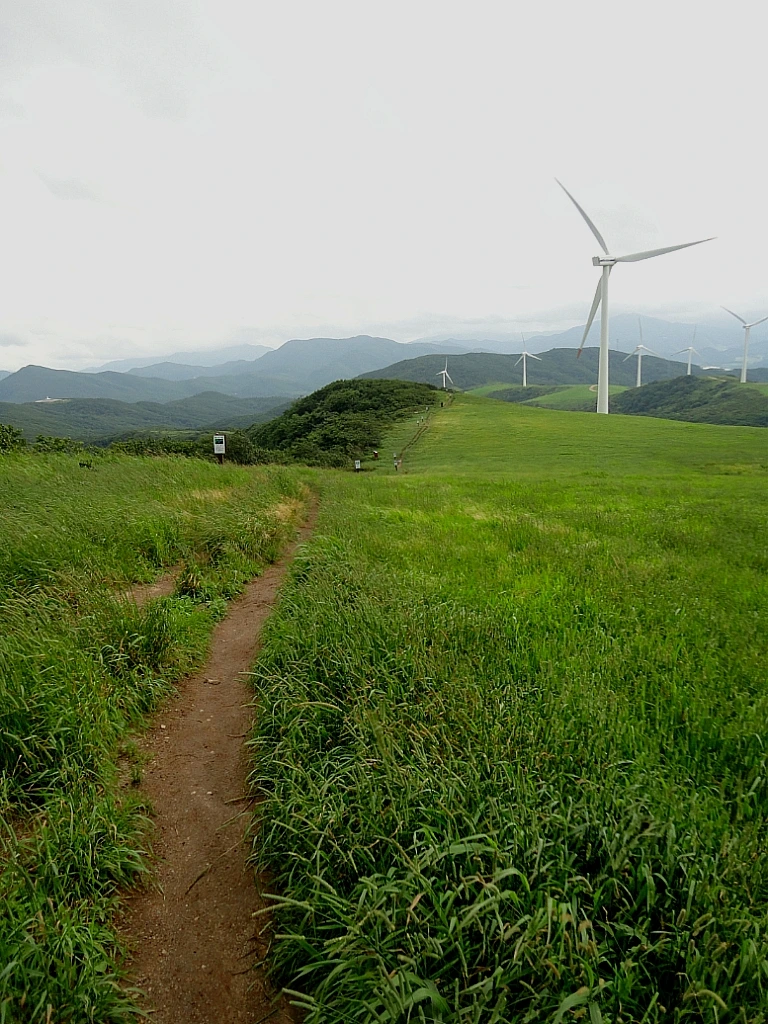 꽃이 물들어 덩달아 청량하게 물들고 싶었던 신록이 엊그제 지나자 선자령에도 더욱 기세 높여 짙푸름을 발산하는 녹음으로 곳곳마다 색감 두드러진다. 새들과 꽃봉오리의 재잘거림이 잦아들어 묵직한 고요가 담담하게 가라앉은 분위기지만 선자령 풍차 길에서 보는 풍력발전기는 여름, 겨울 할 것 없이 그 기세가 여전하다.