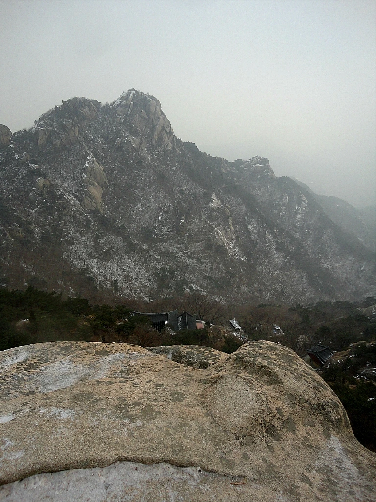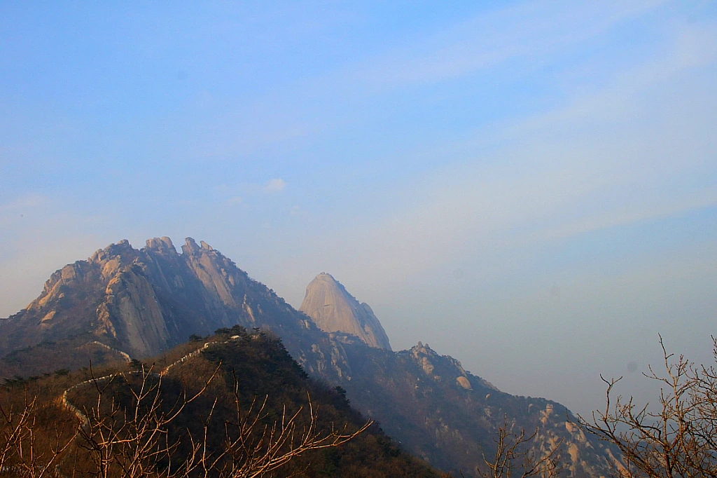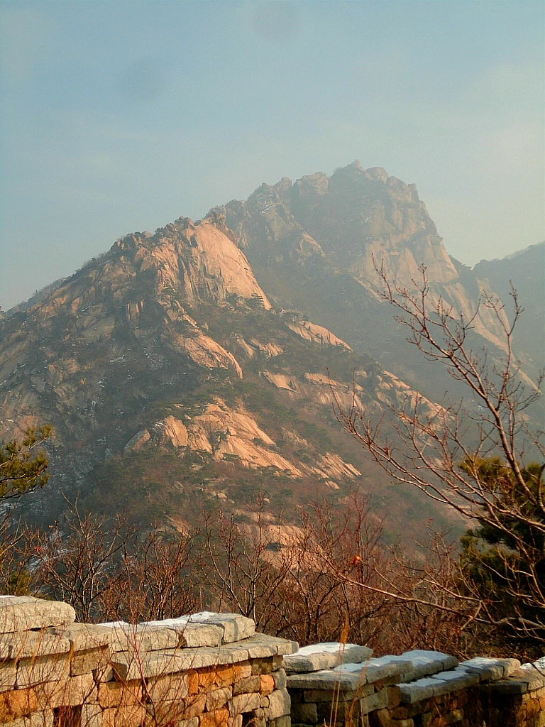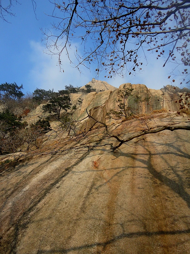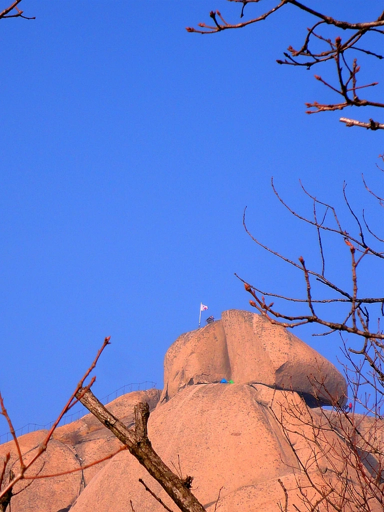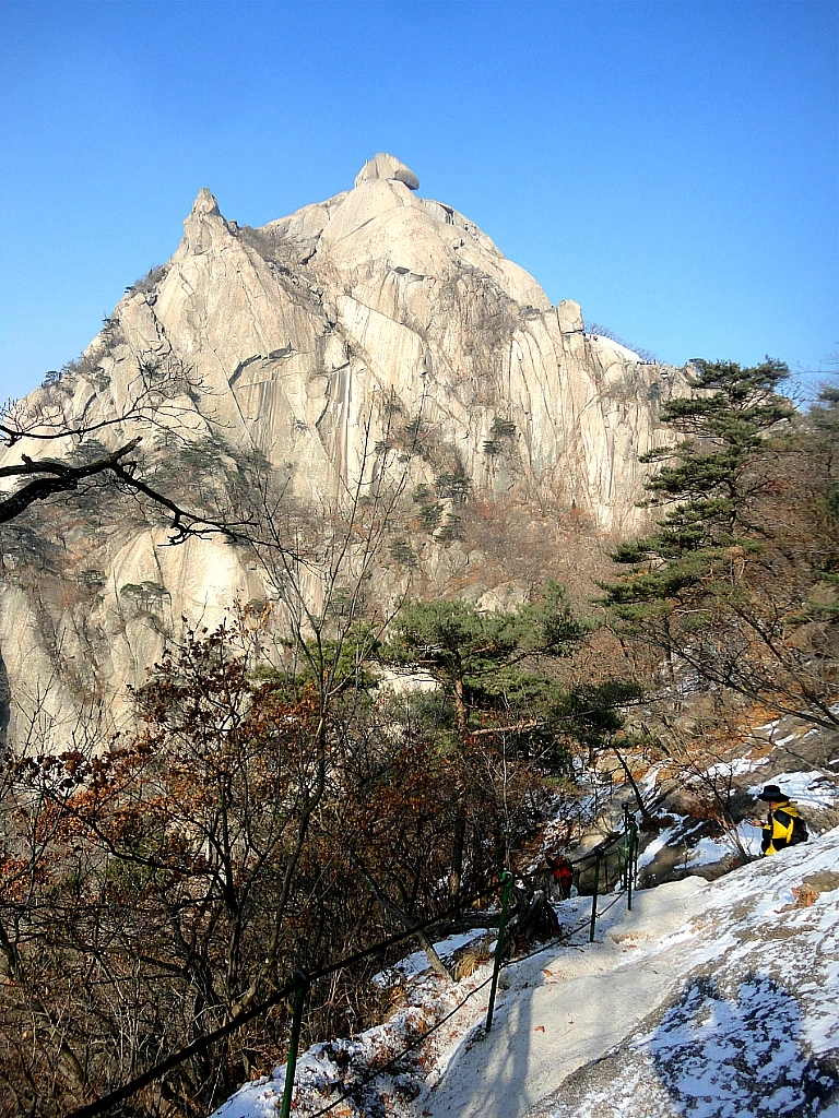최고봉 백운대白雲臺(해발 836m)까지 올라온 건 바람에 펄럭이는 태극기 앞에서 정상까지 올라왔음을 인증하고 싶었다기보다는 인수봉(해발 810.5m)을 보고 싶어서였다. 눈이 녹아 더욱 창백해진 인수봉 거대한 직벽을 가장 가까이에서 바라보면 심신에 묻은 티끌과 오염을 깨끗이 씻는 것처럼 상쾌하다. 오늘은 인수봉에도 클라이머들의 모습이 전혀 보이지 않는다. 그래서 더 깨끗하게 보이는지도 모르겠다. 막 면도하고 세안을 마친 정갈한 모습이다.