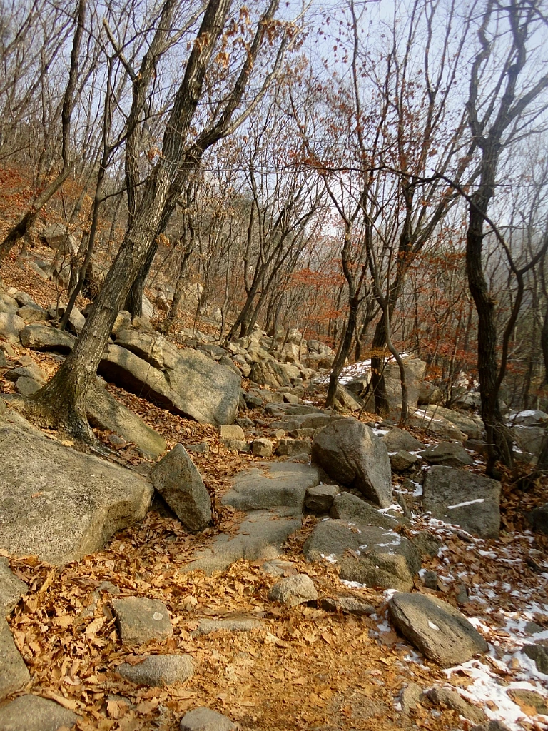 얼어 굳어 더욱 미끄러운 백운대 내리막