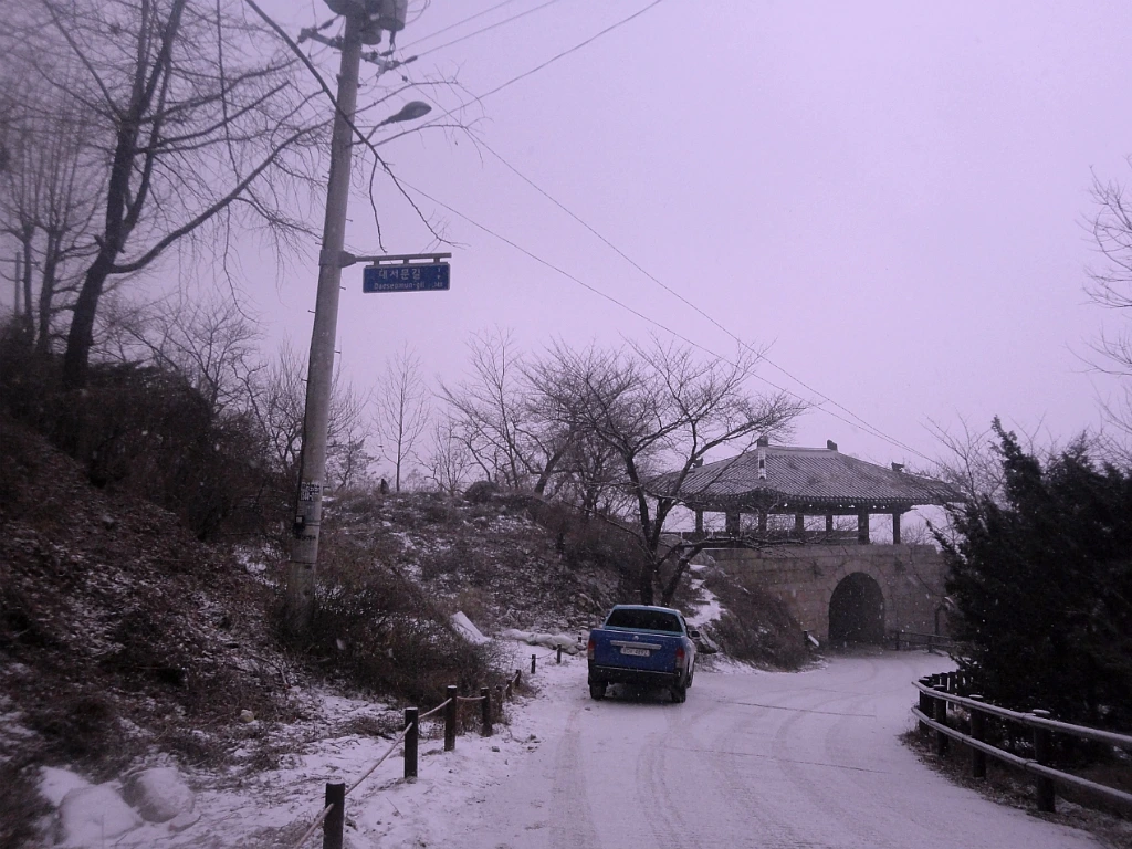 중성문에서 인증만 받고 돌아와 무량사에 이르렀을 때는 잿빛 하늘에 눈발이 굵어지고 있다. 이제 마지막 출구 대서문만 남았다. 대서문까지야 평지 아스팔트 내리막길 아닌가. 하산 즈음에 내리는 눈송이는 그야말로 희열 자체이다. 뿌리는 눈이 아름답게 보이니 피로감도 싹 사라지고 만다.