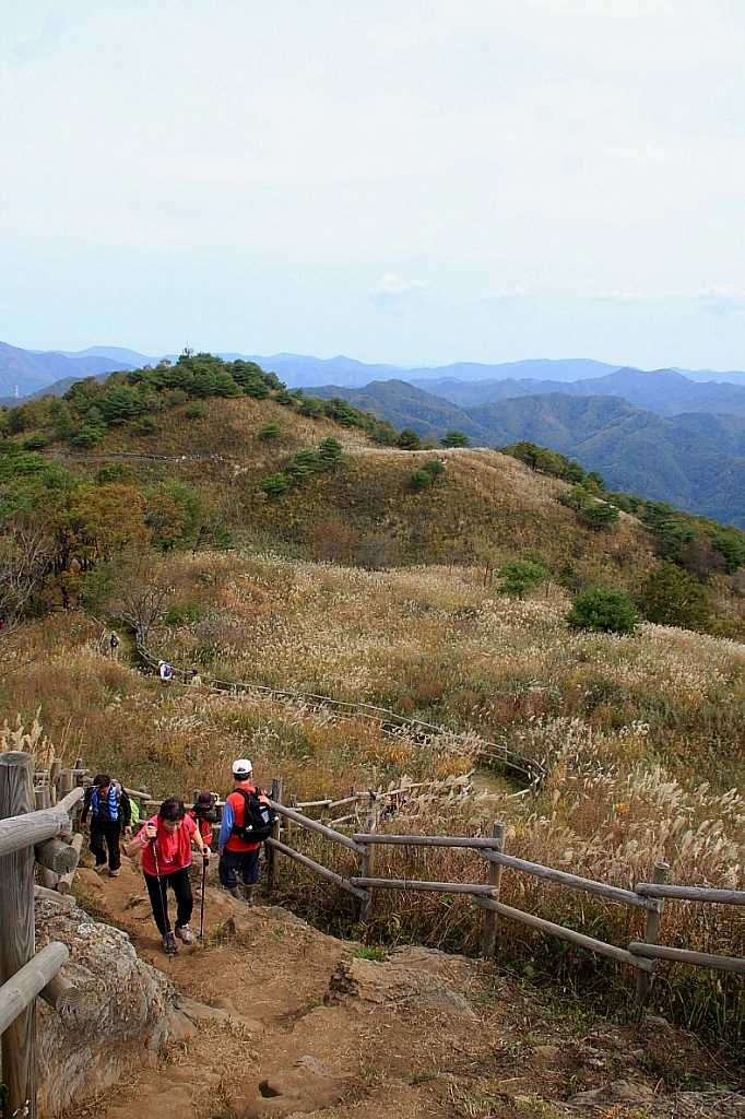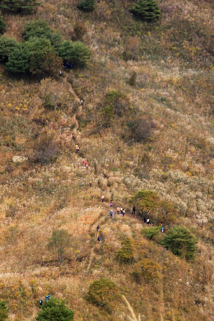 임도를 지나 능선에 오르니 정상까지 길고 완만하게 이어진 길이 억새 방문객들로 가득하다. 정상 지대에 이르자 광활하게 펼쳐진 억새밭에 놀라고 사이사이 길마다 빼곡한 사람들에 또 한 번 놀란다. 신불평원이나 사자평전과는 그 분위기가 사뭇 다르다.