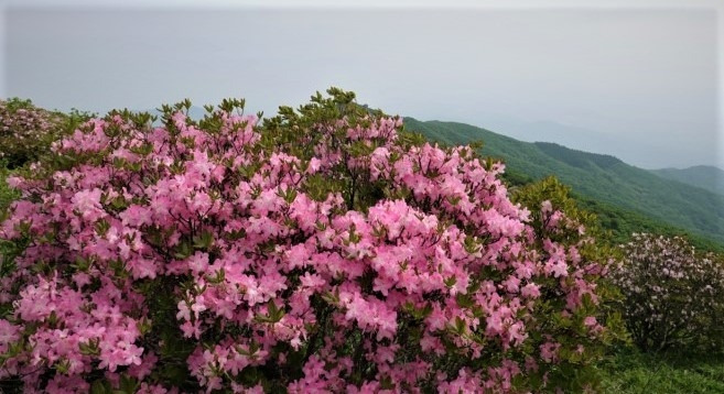 잠시 연화봉의 강한 주체성에 빠져들다가 양쪽으로 늘어선 철쭉꽃길을 걸어 제1연화봉(해발 1394m)에 닿았다. 제1연화봉에서 비로봉 쪽으로는 철쭉 개화가 늦어 아직 꽃잎을 활짝 벌리지 못하고 있다.