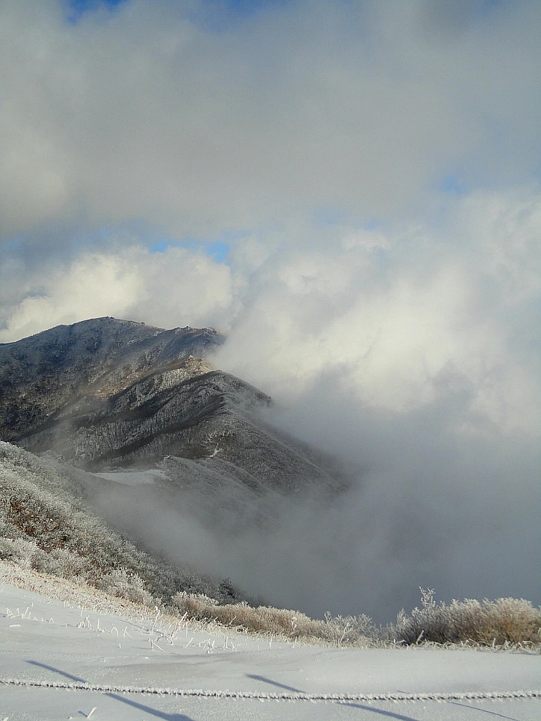 왼편 북릉을 타고 급경사 능선을 길게 오르자 철쭉 군락지의 상고대가 절정의 모습을 보여주면서 함께 올라온 일행들로 하여금 탄성을 자아내게 한다. 두툼한 눈꽃도 겨울 산행의 미각을 한층 돋워준다.