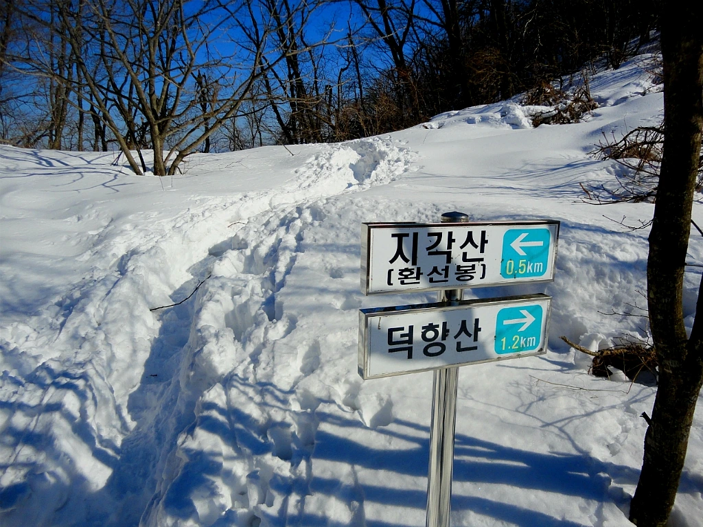 때론 고독한 걸음이 될 수도 있지만, 상대에 대한 배려를 깨닫게 하고 새삼 바른길이 무언지, 옳은 길이 어딘지를 가늠케 하니 눈길은 윤리학 강의실이다. 산에 오면 이처럼 제멋대로 해석해도 뭐라는 이 없으니 사람은 신선이 되고 산은 무릉도원이 되기에 부족함이 없다. 그렇게 머리를 하얗게 비운 상태에서 하얀 눈밭 다지며 닿은 곳이 환선봉, 해발 1080m의 지각산 정상이다.